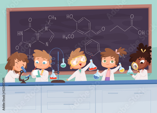 School children scientists. Cartoon child with reading tool pen pencil, go study elementary science, learn education, kid lab scientist cute character splendid vector illustration