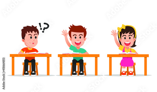 Student vector character turn. Male students in school uniforms studying at school desk.