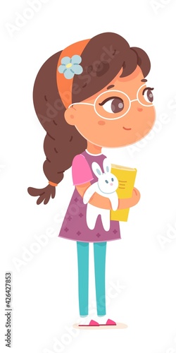 Smiling little girl sitting with open book or textbook. Kid reading children's literature at home. Smart child learning. Colored flat cartoon vector illustration isolated on white background