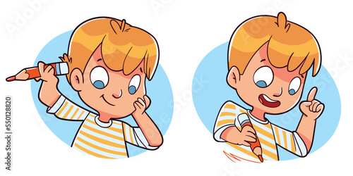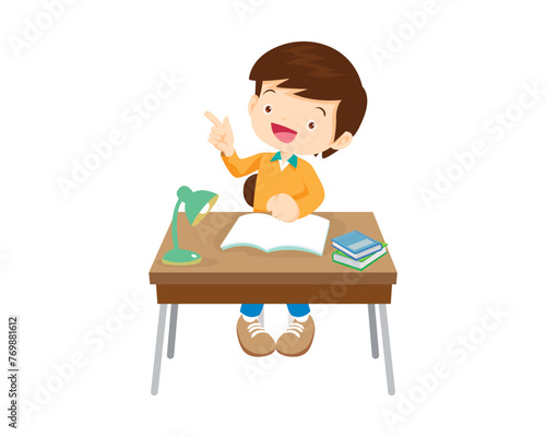 confused kid and understand or found answer.boy reading book then got some idea.Flat vector cartoon illustration
