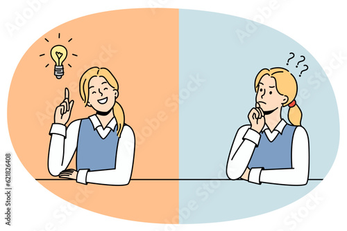 Confused child solution. Kid brainstorming innovation solution question, girl think idea, smart doubt children cartoon character vector illustration