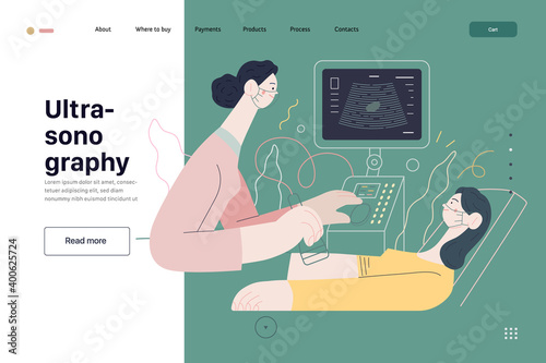 Medical tests illustration - ultrasound - modern flat vector concept digital illustration of ultrasonography procedure -doctor examing patient pregnant woman with scanner, medical office or laboratory