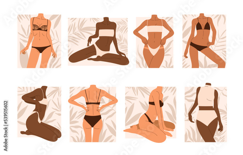 Female body in a swimsuit with tropical leaves set. Woman figure collection. Tanning girls in swimsuits in different poses. Summer vibes aesthetic. Vector illustration in cartoon style. Isolated white