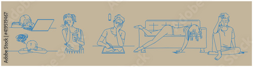 Set of vector colored sketches of dejected people. A young woman in depression panics, cries, yearns. Unhappy man in a bad mood covers his face with his hands. Vector of human emotions. Flat style