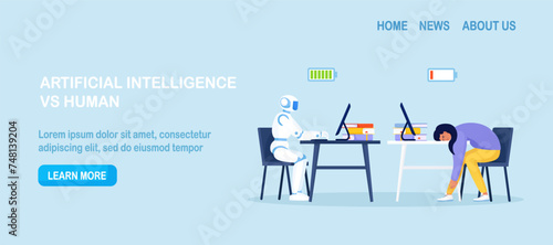 Robot vs human. High productivity artificial intelligence working at computer and tired employee at workplace. Business automation. AI robot work efficiency. Automation or robotic assistance
