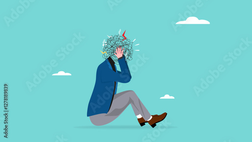 Exhausted businessman with chaos and mess in head suffer from nervous breakdown. Tired emotional man struggle with stress and overwork. Vector illustration.