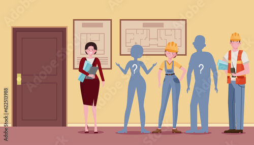 Line of tired labor workers vector illustration. Builders, engineers, mechanics with empty silhouettes between them in office. Employee shortage, lack of personnel, labor crisis concept