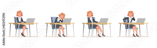 Young Office Woman Sitting at Desk with Laptop Engaged in Workflow Vector Set.