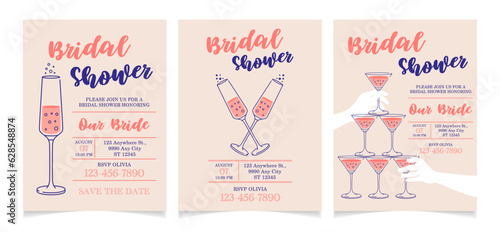 Bridal shower pink invitation cards design. Illustrations of champagne glasses with bubbles, vector. Bubbles of sparkling wine, wedding concept. Event, party, presentation, promotion, menu.