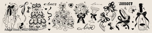 Hand drawn coquette aesthetics elements. Vintage cute symbols with ribbon and bow in simple crayon and sketch style. Trendy art for Valentine day and wedding invitations. Outline vector illustration