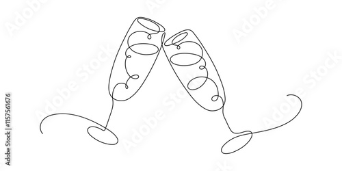 Continuous line champagne cheers one line art, continuous drawing contour. Hands toasting with wine glasses with drinks. Cheers toast festive decoration for holidays. Vector illustration