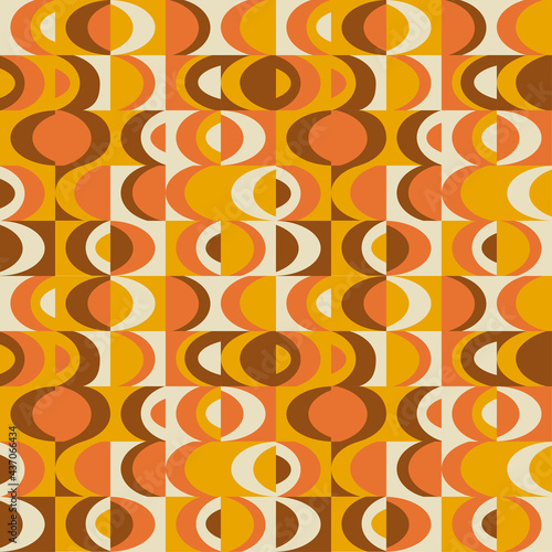 Vintage geometric floral seamless pattern. Retro 70s nostalgic simple shaped groovy flowers with circles colorful background.