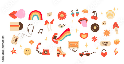 Big retro set of stickers with 70s 80s style elements. Old fashioned objects, psychedelic mushroom and daisy flower. Hippie outline colored icons. Vector illustration.