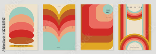 Collection of 70s color gradient poster background vector. Set of retro wall decoration, groovy, trippy, geometric shape. Vintage hippie wall art for interior, decorative, banner, cover, card.