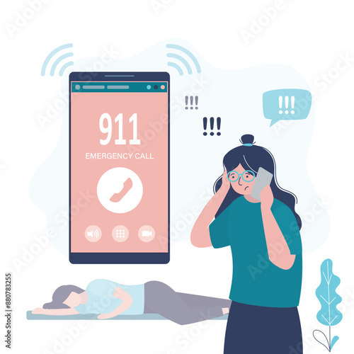 911 calling in flat style. Vector flat design. Finger touch screen. First aid. Call screen smartphone. Vector illustration