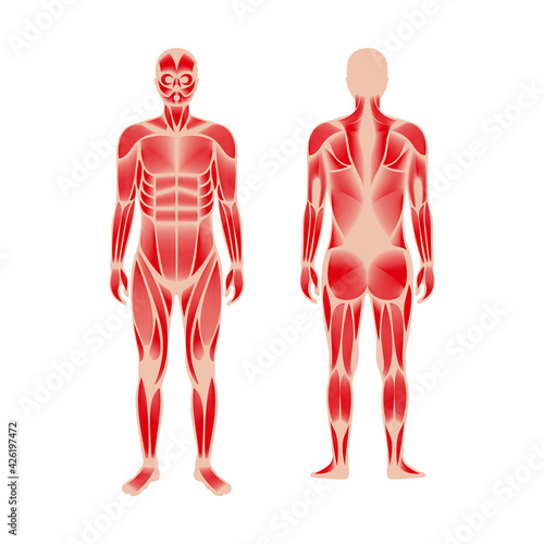 Vector diagram of the human muscular system showing major muscle groups from anterior and posterior views.