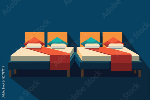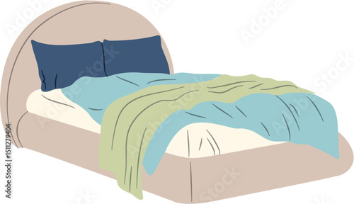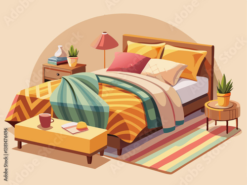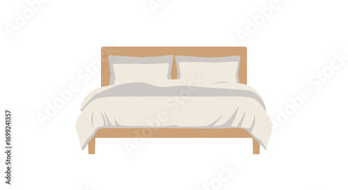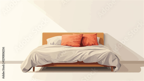 A high-quality vector of a cozy bed with soft pillows and a warm-toned blanket, placed on a muted pastel beige background.