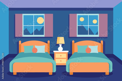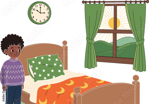 Cozy bedroom morning scene with child, sunrise view, bed and window, daily routine, home interior illustration, vector art for lifestyle and education design