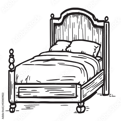 Black and white line drawing of a neatly made bed with pillows, blankets, and a headboard in a bedroom setting