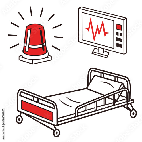 Medical emergency scene with hospital bed flashing siren light and heart monitor displaying vital signs