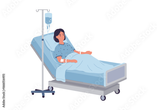 A woman lies in a hospital bed with an IV drip attached to her arm
