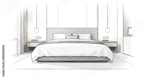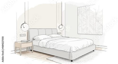Elegant bedroom interior scene with comfortable bed, sketched in detail