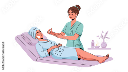 Caring nurse gently washes patient s face while they recline on a medical bed with skincare products nearby
