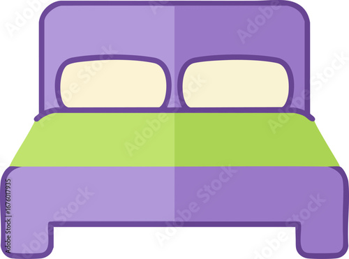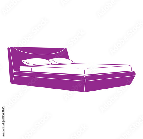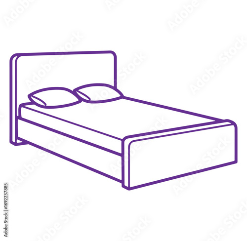 Simple purple outline illustration of a comfortable double bed with pillows for sleeping