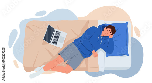 A man sleeping on a bed with a laptop, representing rest and leisure