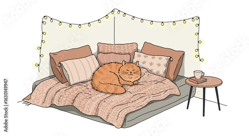 Bedroom interior with a cat. hand drawn style vector design illustrations.