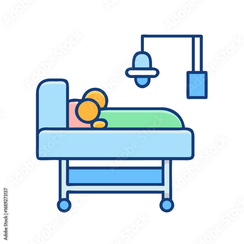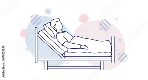An illustration depicting a male patient resting in a hospital bed with an intravenous drip, surrounded by medical equipment.