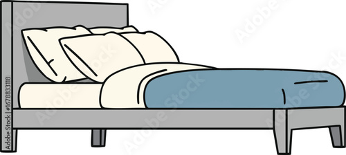 Illustration of a gray bed frame with three pillows and a blue blanket in a bedroom scene