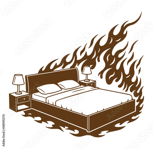 Illustration of a bed on fire with lamps and nightstands in brown and white