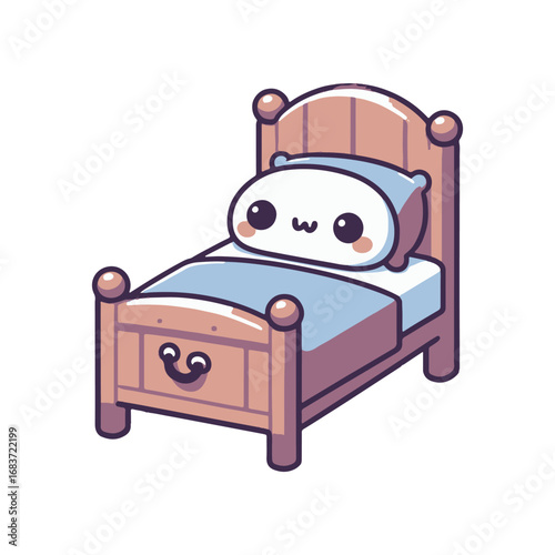 Cute animated character sleeping in a cozy cartoon bed with a blue pillow and wooden frame