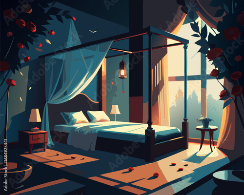 colorful illustration of a creepy bedroom with canopy bed covered in wilted fabric