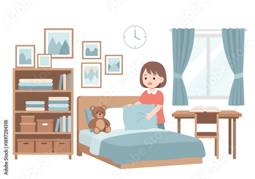 Adobe illustrator artwork vector illustration. A diligent young girl is making her bed in a tidy and cozy bedroom, demonstrating responsibility and neatness in her daily routine