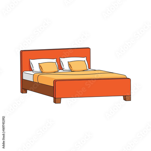 Vibrant orange modern bedroom furniture bed frame with pillows and duvet cozy comfort vector