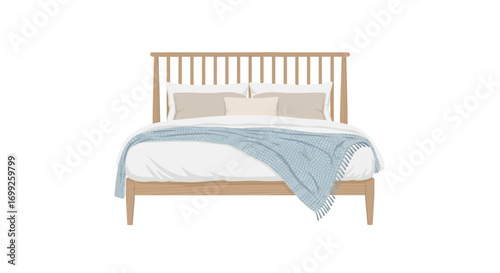 Elegant bed with cozy blue throw blanket and decorative cushions resting