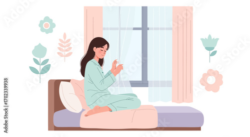 Woman in pajamas sitting on bed opening curtains in the morning at home