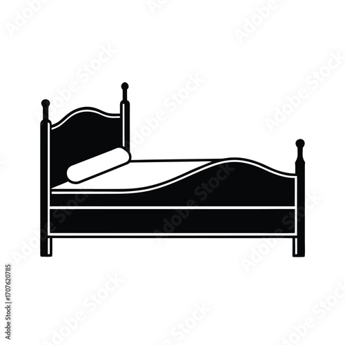 Simple monochromatic silhouette illustration of a comfortable bed with soft pillows and a lamp on a bedside table. Bedroom concept, bedroom logo design illustration and bedroom vector design