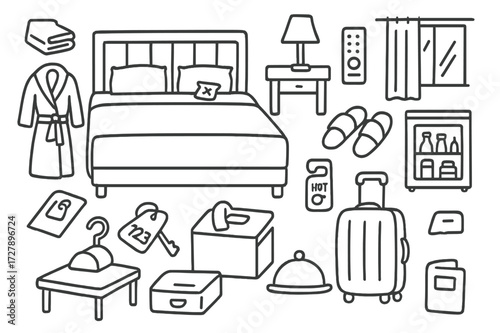 Hotel Room Sketch. Hand-drawn doodle illustration [hotel bed setup] [king bed, folded towel, robe, slippers, hotel key, lamp, minibar, suitcase, pillow mint,
