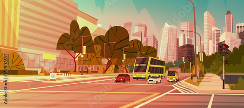 City Street Skyscraper Buildings Road View Modern Cityscape Empty Downtown Flat Vector Illustration