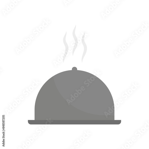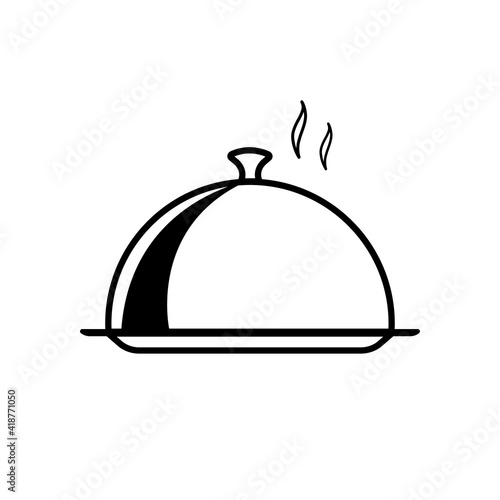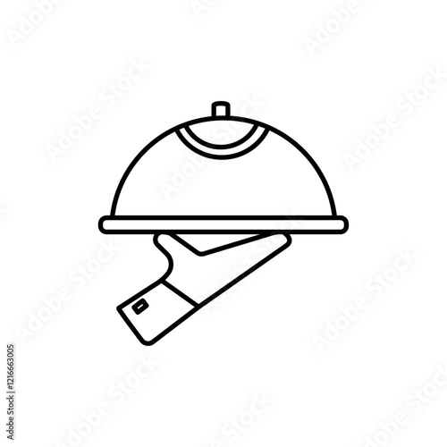 Waiter hand in glove holds a tray with a lid over white background. Simple illustration vector logo, isolated. Classic banner or label for restaurants, cafe and any business.