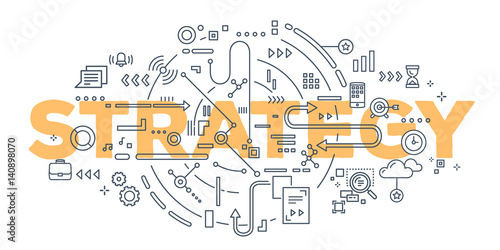 Vector creative illustration of strategy word lettering typography with line icons on white background.
