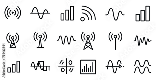 Sound wave icons in radio and audio style. Signal symbols for broadcasting, internet and communication. Minimal black graphics for media concepts
