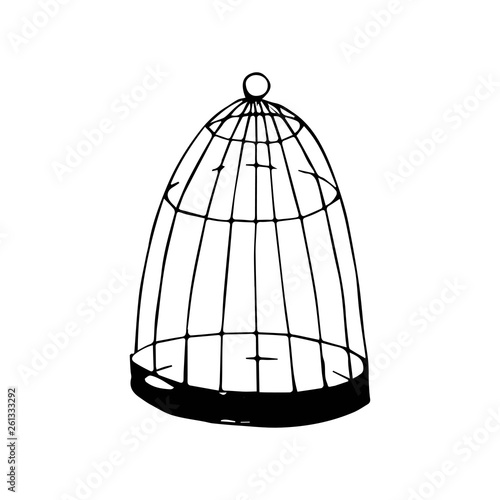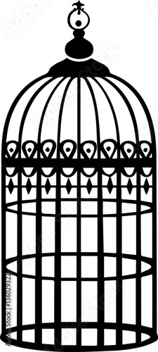 The image is a minimalist vector illustration featuring a black silhouette of a bird perched on the top of a birdcage. The bird appears to be in the act of taking flight. The cage is