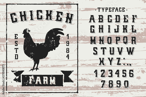 The logo of the poultry farm in vintage, Scandinavian style on a worn wooden background. Vector illustration with a set of letters and numbers drawn by hand
