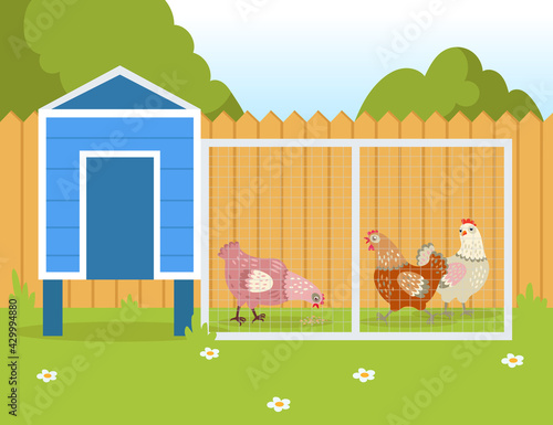 Chicken coop with chickens, hen house cartoon vector illustration.
