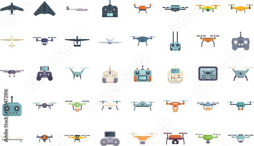 Drone technology icons set flat vector. Vr delivery. Helicopter survey isolated