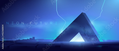 Cityscape on dark blue background with bright glowing neon. Technology city background